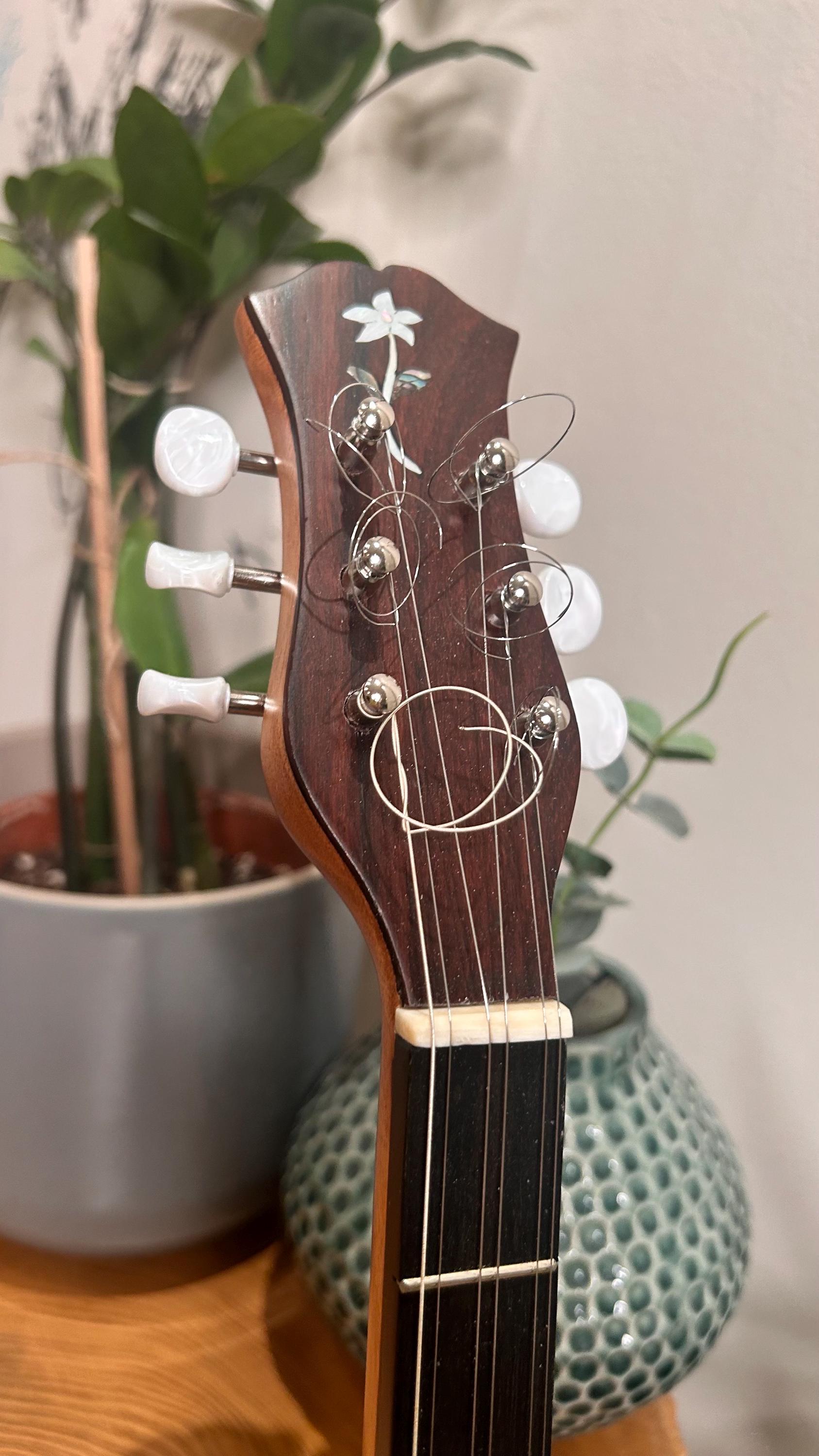 Fingerboard: Crafted from Ebony and adorned with Mother of Pearl Dots, the fingerboard provides a smooth and responsive playing surface, guiding your musical journey.